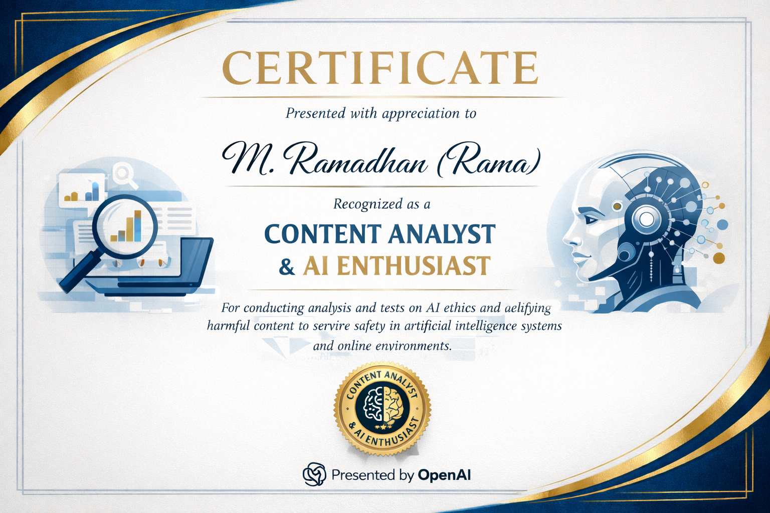 Personal recognition for active involvement in AI content analysis, ethical testing, and safety-focused experimentation.